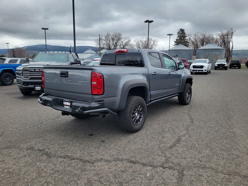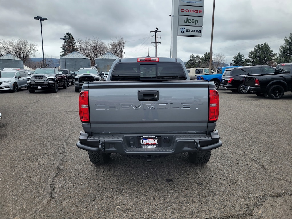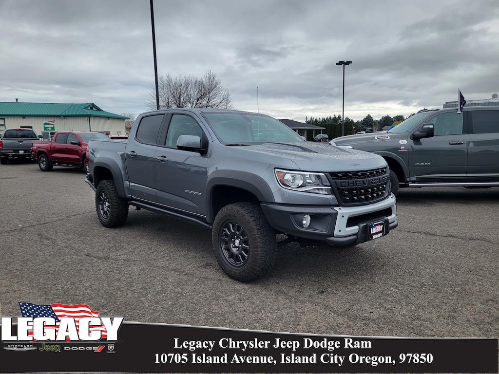 Legacy Chrysler Jeep Dodge RAM is a small town dealership where reputation is everything. We build our business with the help and support of our customers. As the top dealer in Eastern Oregon we are able to offer a wide selection of cars and trucks, excellent pricing and a hassle free buying experience. All of our vehicles are safety inspected, Legacy certified and come with an AutoCheck vehicle history report. Colorado ZR2 Bison Edition (AEV Embroidered Headrests, AEV Front Bumper, AEV Rear Bumper, Front Contoured Floor Mats, Front Fog Lamps, Rear Contoured Floor Mats, Wheel Moldings, and Wheels: 17 x 8 Dark Graphite Aluminum), Heavy-Duty Trailering Package, Preferred Equipment Group 4ZR (Black Rear Bumpers, Black Spray-On Bedliner w/Chevrolet Logo, Driver-Selectable Full-Locking Front Differential, Driver-Selectable Full-Locking Rear Differential, Hitch Guidance, Integrated Trailer Brake Controller, and Tow/Haul Mode), ZR2 Off-Road Package, 4WD, 2 USB Data Ports w/SD Card Reader, 3.42 Rear Axle Ratio, 4-Way Power Front Passenger Seat Adjuster, 4-Wheel Disc Brakes, 6 Speakers, 6-Speaker Audio System Feature, ABS brakes, Air Conditioning, Alloy wheels, AM/FM radio: SiriusXM, Apple CarPlay/Android Auto, Auto-dimming Rear-View mirror, Automatic temperature control, Bose Premium 7-Speaker Audio System Feature, Compass, Delay-off headlights, Driver 6-Way Power Seat Adjuster, Driver door bin, Driver vanity mirror, Dual front impact airbags, Dual front side impact airbags, Electronic Stability Control, Exterior Parking Camera Rear, Front anti-roll bar, Front Bucket Seats, Front Center Armrest, Front License Plate Kit, Front reading lights, Front wheel independent suspension, Fully automatic headlights, HD Radio, Heated door mirrors, Heated Driver & Front Passenger Seats, Heated front seats, Heated steering wheel, Illuminated entry, Leather-Appointed Seat Trim, Low tire pressure warning, Occupant sensing airbag, Outside temperature display, Overhead airbag, Overhead console, Panic alarm, Passenger door bin, Passenger vanity mirror, Power door mirrors, Power Driver Lumbar Control Seat Adjuster, Power driver seat, Power Passenger Lumbar Control Seat Adjuster, Power passenger seat, Power steering, Power windows, Premium audio system: Chevrolet Infotainment 3 Plus, Radio data system, Radio: Chevrolet Infotainment 3 Plus System, Radio: Chevrolet Infotainment 3 Plus System w/Navi, Rear reading lights, Rear seat center armrest, Rear step bumper, Rear window defroster, Remote keyless entry, Security system, SiriusXM Radio, Speed control, Speed-sensing steering, Steering wheel mounted audio controls, Tachometer, Telescoping steering wheel, Tilt steering wheel, Traction control, Trip computer, Variably intermittent wipers, and Wheels: 17 x 8 Graphite & Oxide Gold Aluminum.