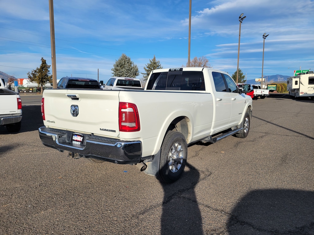 Legacy Chrysler Jeep Dodge RAM is a small town dealership where reputation is everything. We build our business with the help and support of our customers. As the top dealer in Eastern Oregon we are able to offer a wide selection of cars and trucks, excellent pricing and a hassle free buying experience. All of our vehicles are safety inspected, Legacy certified and come with an AutoCheck vehicle history report. Cold Weather Group (Engine Block Heater and Winter Front Grille Cover), Laramie Level 1 Equipment Group (2nd Row In Floor Storage Bins, Auto High Beam Headlamp Control, Blind Spot & Cross Path Detection, Exterior Mirrors w/Memory, Foam Bottle Insert (Door Trim Panel), Mirror-Mounted Aux Reverse Lamps, Power Adjustable Convex Aux Mirrors, Power Adjustable Pedals w/Memory, Power Chrome Tow Mirrors w/Convex Spotter & Memory, Radio/Driver Seat/Mirrors/Pedals Memory, Rain Sensitive Windshield Wipers, Remote Tailgate Release, Single Disc Remote CD Player, and Ventilated Front Seats), Protection Group, Quick Order Package 2HH Laramie, Towing Technology Group (CTR Stop Lamp w/Cargo View Camera, Surround View Camera System, and Trailer Reverse Guidance), #1 Seat Foam Cushion, 10 Speakers, 115V Auxiliary Rear Power Outlet, 12 Touchscreen Display, 2 Way Rear Headrest Seat, 220 Amp Alternator, 3.73 Axle Ratio, 4 Way Front Headrests, 4-Wheel Disc Brakes, 5th Wheel/Gooseneck Towing Prep Group, ABS brakes, Active Noise Control System, Adjustable pedals, Air Conditioning, Alloy wheels, AM/FM radio: SiriusXM, Apple CarPlay, Apple CarPlay/Android Auto, Auto-dimming Rear-View mirror, Automatic temperature control, Brake assist, Bumpers: chrome, Center Hub, Compass, Delay-off headlights, Driver door bin, Driver vanity mirror, Dual front impact airbags, Dual front side impact airbags, Electronic Stability Control, Electronically Controlled Throttle, Folding Flat Load Floor Storage, Front anti-roll bar, Front Bumper Sight Shields, Front Center Armrest w/Storage, Front dual zone A/C, Front fog lights, Front reading lights, Front Seat Back Map Pockets, Fully automatic headlights, Garage door transmitter, Google Android Auto, GPS Antenna Input, Heated door mirrors, Heated Front Seats, Heated front seats, Heated Steering Wheel, Heated steering wheel, High Back Seats, Illuminated entry, Integrated Voice Command w/Bluetooth, Leather steering wheel, Leather Trim 40/20/40 Bench Seat, LED Bed Lighting, Low tire pressure warning, Manufacturer's Statement of Origin, Occupant sensing airbag, Outside temperature display, Overhead airbag, Overhead console, Panic alarm, ParkView Rear Back-Up Camera, Passenger door bin, Passenger vanity mirror, Power 8-Way Adjustable Passenger Seat, Power Adjust 8-Way Driver Seat, Power door mirrors, Power driver seat, Power passenger seat, Power steering, Power windows, Radio data system, Radio: Uconnect 12.0 w/Navigation, Radio: Uconnect 4 w/8.4 Display, Rear 60/40 Folding Seat, Rear reading lights, Rear seat center armrest, Rear step bumper, Rear Wheelhouse Liners, Rear window defroster, Remote keyless entry, Security system, Selectable Tire Fill Alert (DISC), SiriusXM Satellite Radio, SiriusXM w/360L, Speed control, Split folding rear seat, Steering wheel mounted audio controls, Tachometer, Tilt steering wheel, Tip Start, Traction control, Trip computer, Turn signal indicator mirrors, USB Host Flip, Variably intermittent wipers, Voltmeter, and Wheels: 18 x 8.0 Polished Aluminum.