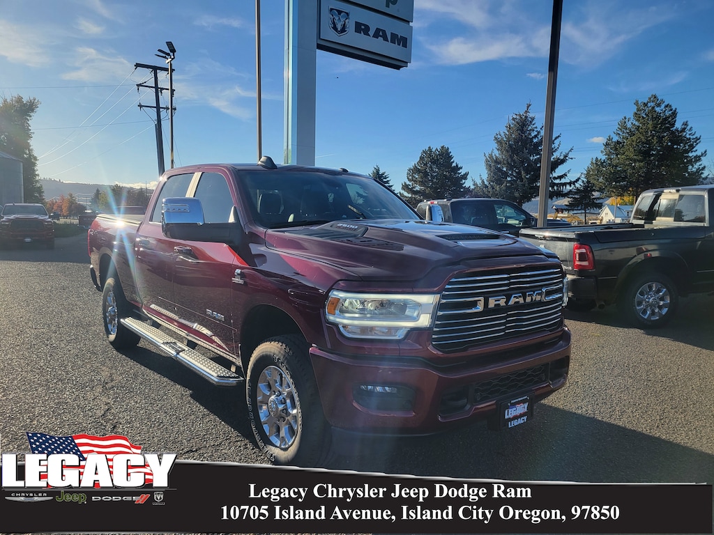 Legacy Chrysler Jeep Dodge RAM is a small town dealership where reputation is everything. We build our business with the help and support of our customers. As the top dealer in Eastern Oregon we are able to offer a wide selection of cars and trucks, excellent pricing and a hassle free buying experience. All of our vehicles are safety inspected, Legacy certified and come with an AutoCheck vehicle history report. Cold Weather Group (Engine Block Heater and MOPAR Winter Front Grille Cover), Laramie Level 1 Equipment Group (12 Touchscreen Display, 2nd Row In Floor Storage Bins, 4G LTE Wi-Fi Hot Spot, Alexa Built-In, Apple CarPlay, Auto Adjust In Reverse Exterior Mirrors, Auto Dim Exterior Mirror, Auto High Beam Headlamp Control, Auto Power-Folding Mirrors, Auto-Dimming Exterior Passenger Mirror, Blind Spot & Cross Path Detection, Chrome Exterior Mirrors, Connected Travel & Traffic Services, Connectivity - US/Canada, Disassociated Touchscreen Display, Exterior Mirrors Courtesy Lamps, Exterior Mirrors w/Heating Element, Exterior Mirrors w/Memory, Exterior Mirrors w/Supplemental Signals, Foam Bottle Insert (Door Trim Panel), For Details, Visit DriveUconnect.com, For More Info, Call 800-643-2112, Forward & Reverse Utility Lights, Front LED Fog Lamps, Global Telematics Box Module (TBM), Google Android Auto, GPS Antenna Input, GPS Navigation, HD Radio, Integrated Voice Command w/Bluetooth, LED Reflector Headlamps, Mirror Running Lights, Off-Road Information Pages, ParkSense Front/Rear Park Assist System, Power Adjust Mirrors, Power Adjustable Convex Aux Mirrors, Power Adjustable Pedals w/Memory, Power Heated Fold Telescopic Mirrors w/Memory, Power Telescoping Mirrors, Radio: Uconnect 5 Nav w/12.0 Display, Radio/Driver Seat/Mirrors/Pedals Memory, Rain Sensitive Windshield Wipers, Rear Power Sliding Window, Rear Window Defroster, Remote Tailgate Release, Selectable Tire Fill Alert, SiriusXM Radio Service, SiriusXM w/360L, and Trailer Tow Pages), Protection Group (Tow Hooks), Quick Order Package 2HH Laramie, Sport Appearance Package (Black Interior Accents, Body Color Grille Surround, Sport Decal, and Sport Performance Hood), 10 Speakers, 115V Auxiliary Rear Power Outlet, 2 Way Rear Headrest Seat, 220 Amp Alternator, 3.73 Axle Ratio, 4 Way Front Headrests, 4-Wheel Disc Brakes, ABS brakes, Active Noise Control System, Air Conditioning, Alloy wheels, AM/FM radio: SiriusXM with 360L, Apple CarPlay/Android Auto, Auto-dimming Rear-View mirror, Automatic temperature control, Brake assist, Bumpers: body-color, Chrome Flat Wheel-to-Wheel Side Steps, Compass, Delay-off headlights, Driver door bin, Driver vanity mirror, Dual front impact airbags, Dual front side impact airbags, Electronic Stability Control, Electronically Controlled Throttle, Front anti-roll bar, Front Center Armrest w/Storage, Front dual zone A/C, Front License Plate Bracket, Front reading lights, Front Seat Back Map Pockets, Fully automatic headlights, Garage door transmitter, Heated door mirrors, Heated Front Seats, Heated front seats, Heated Steering Wheel, Heated steering wheel, Illuminated entry, Leather steering wheel, Leather Trim 40/20/40 Bench Seat, Low tire pressure warning, Manufacturer's Statement of Origin, MOPAR Front & Rear Rubber Floor Mats, MOPAR Spray In Bedliner, Navigation System, Occupant sensing airbag, Outside temperature display, Overhead airbag, Overhead console, Panic alarm, ParkView Rear Back-Up Camera, Passenger door bin, Passenger vanity mirror, Power 2-Way Driver Lumbar Adjust, Power 2-Way Passenger Lumbar Adjust, Power Adjust 8-Way Driver Seat, Power Adjust 8-Way Front Passenger Seat, Power door mirrors, Power driver se